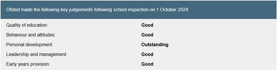 From September 2024, Ofsted no longer makes an overall effectiveness judgement in inspections of state-funded schools, instead using a five- point grading scale. The results of which are shown in the table below. You can view our most recent inspection report here.